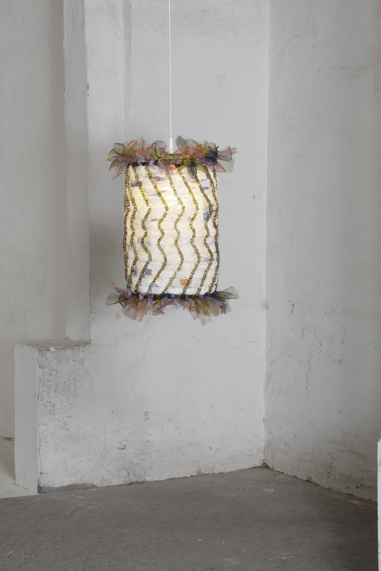 Material: Drahtgeflecht, Organza, Acrylperlen